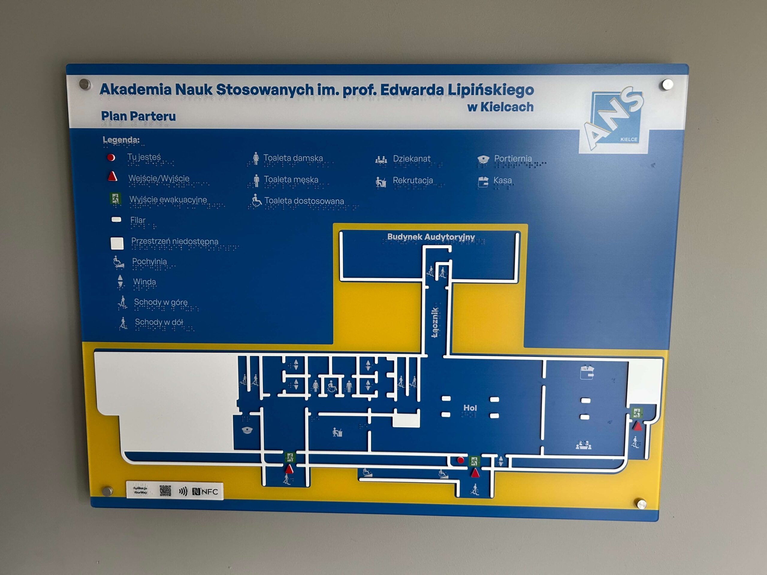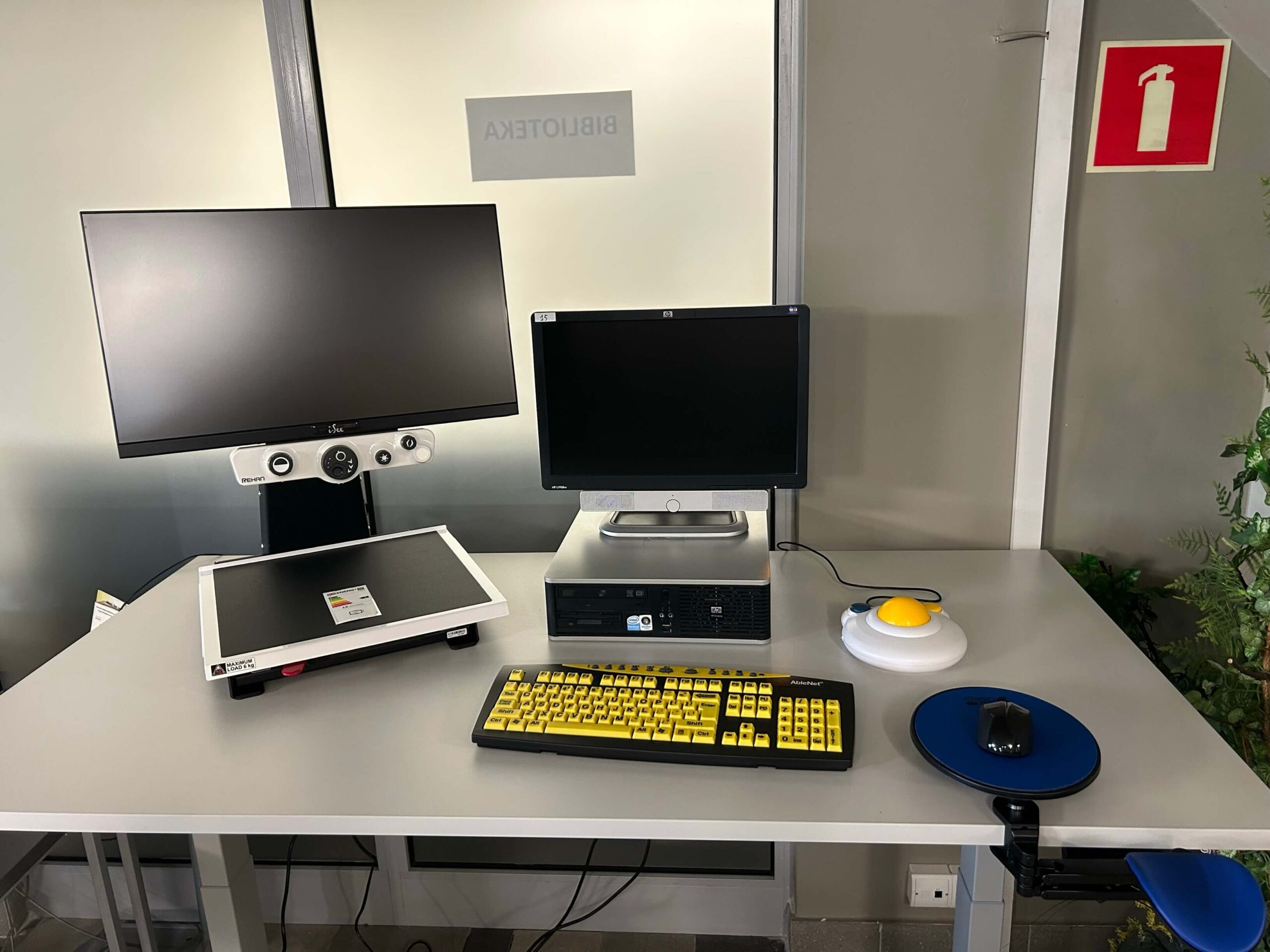 - Wyposażyła przestrzeń i stanowiska – zakupiono apteczki, pętle indukcyjne, ławki, tablicę tyflograficzną, sprzęt komputerowy dla studentów i pracowników z OzN, wyposażenie biblioteki i dziekanatu.